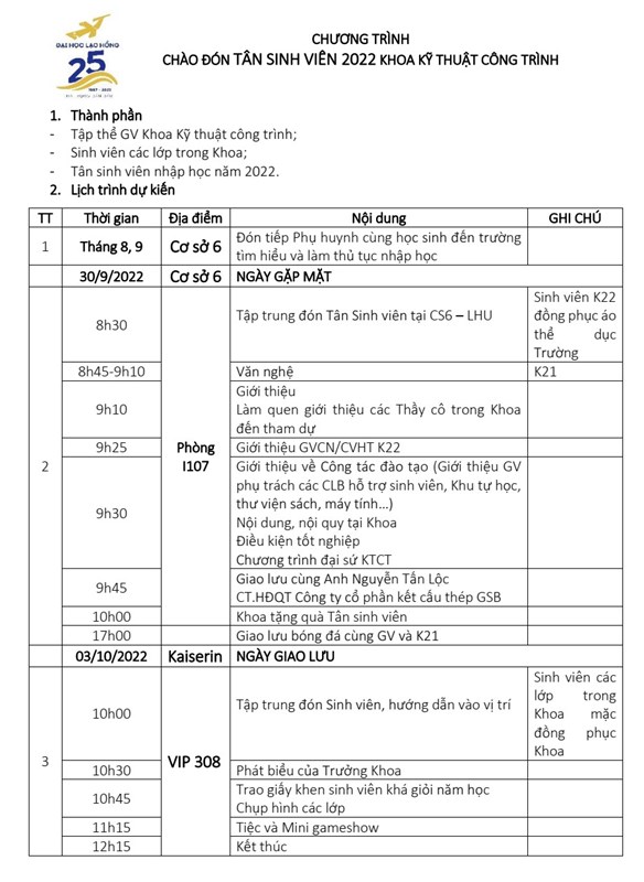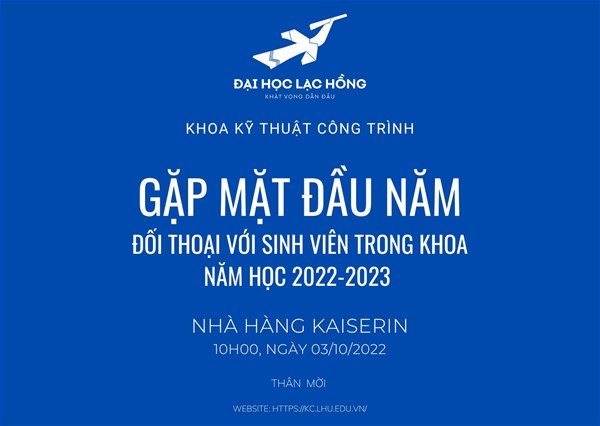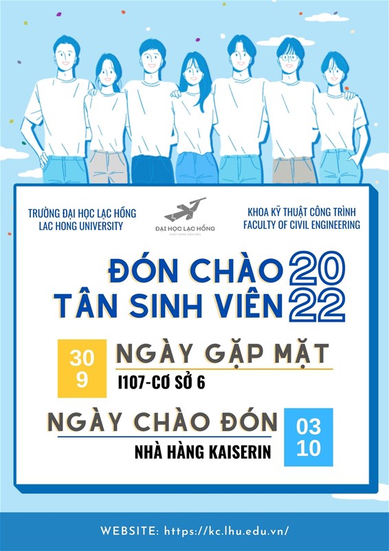 Khoa Kỹ thuật công trình tổ chức tổ chức chuỗi sự kiện trong chương trình CHÀO ĐÓN TÂN SINH VIÊN 2022 bao gồm: gặp mặt  tân sinh viên sinh viên, chào đón tân sinh viên khóa mới, tổng kết và trao thưởng năm học, giao lưu thể thao, tiệc tại nhà hàng trong tuần từ 26/9 đến 03/10/2022.