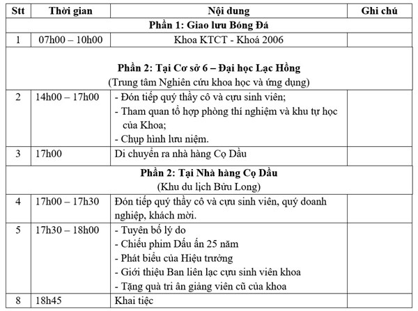 Nằm trong chuỗi sự kiện hướng đến kỷ niệm25 năm ngày thành lập Trường Đại học Lạc Hồng và Khoa Kỹ thuật công trình. Khoa Kỹ thuật công trình tổ chức chương trình Họp mặt Cựu sinh viên tất cả các Khoá trong Khoa từ năm 1997.