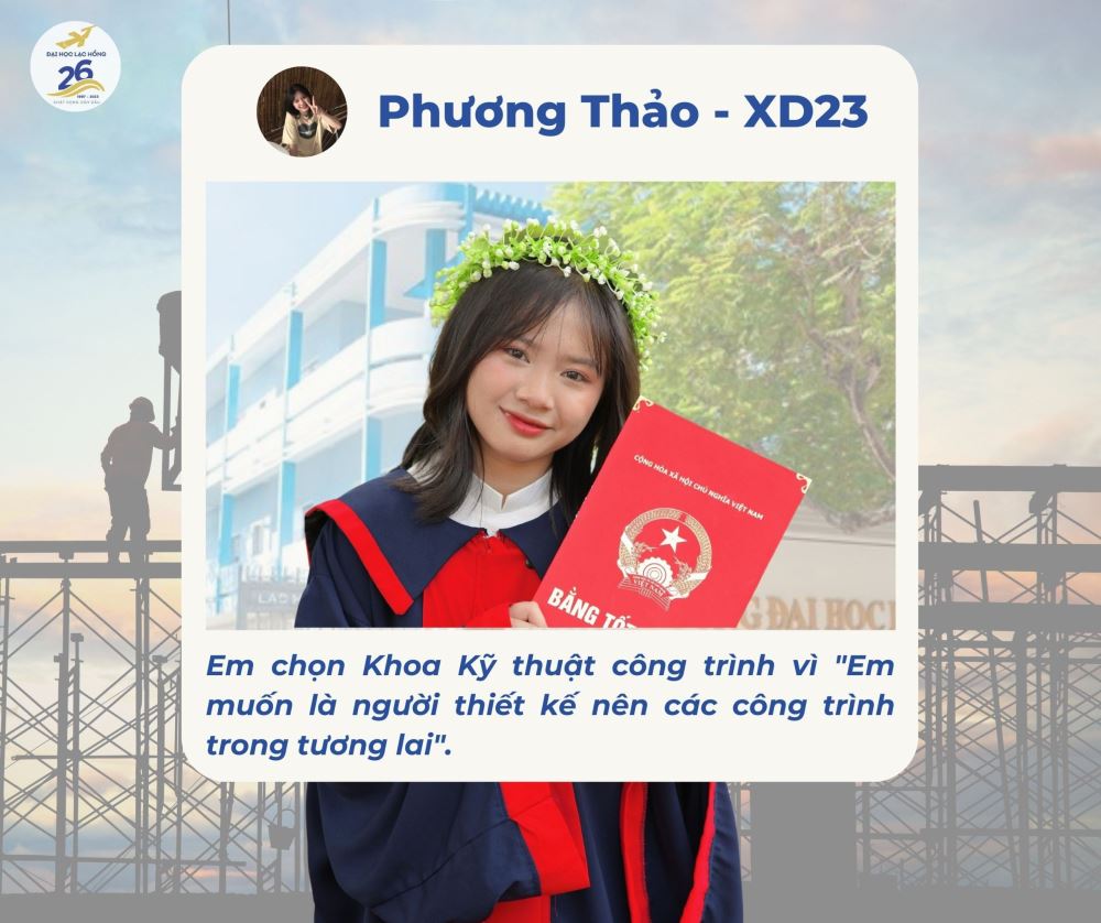 "Kinh tế đang phát triển, xây dựng nhiều công trình hiện đại, khang trang ngày càng tăng. Học ngành xây dựng sẽ có nhiều cơ hội việc làm. Nhất là đối với Nữ". Tân sinh viên Phương Thảo nói về quyết định của mình khi chọn học ngành Xây dựng.