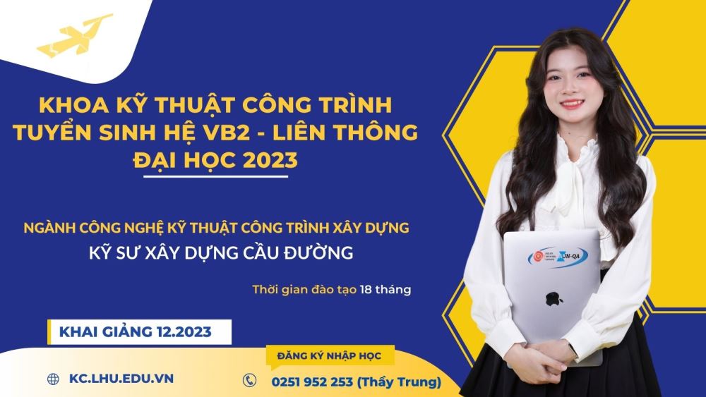 Khoa Kỹ thuật công trình thông báo tuyển sinh lớp Văn bằng 2 - Liên thông đại học năm 2023 ngành Xây dựng, chuyên ngành Xây dựng Cầu đường, dự kiến khai giảng ngày 28/12/2023.