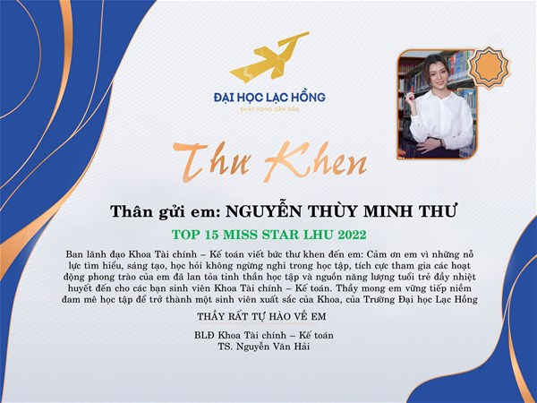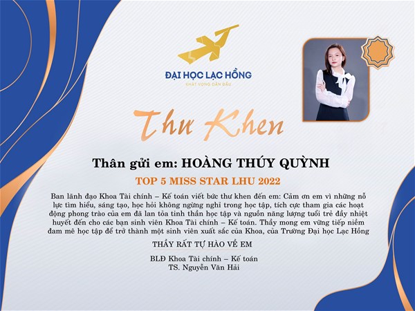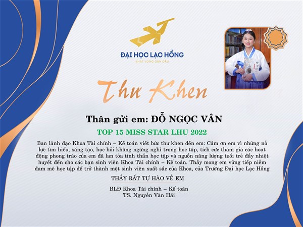 The citation of the letter done by the media department of the FFA : ”Thanks for your non-stop efforts of inquiring, studying, creating and positively enrolling in the activities which bring the enthusiasm, the energy of youth and academic spirit to the FFA students. I hope that you will pursue the passion of studying to become an excellent student of the Faculty at LHU”.