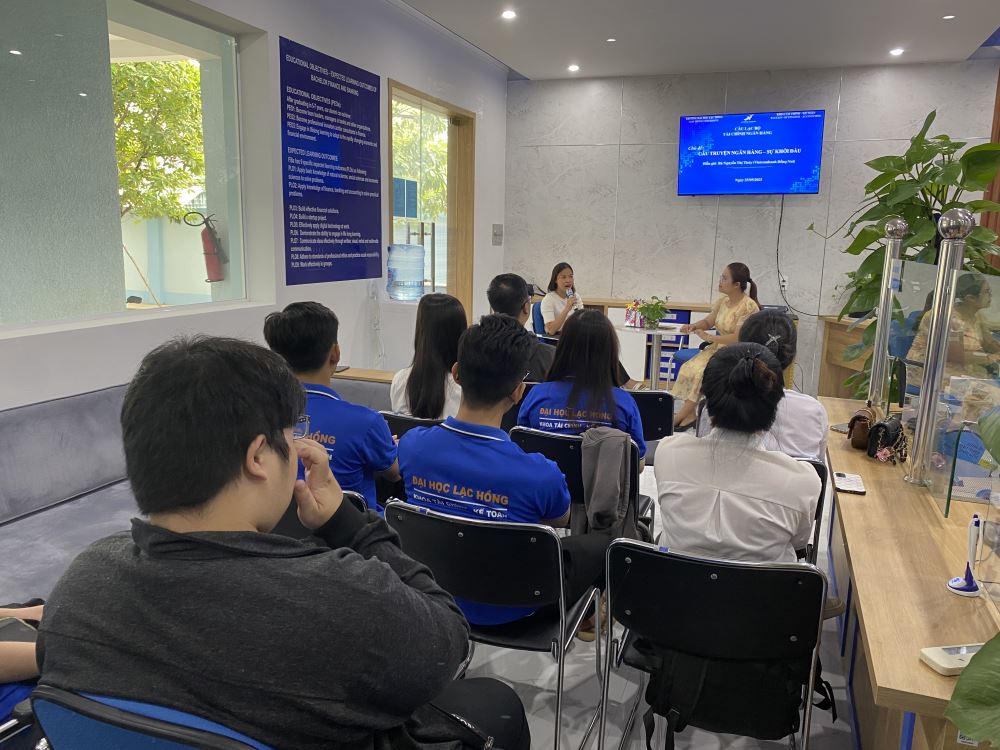 On the afternoon of May 25, 2023, the Financial Club, under the Faculty of Finance and Accounting, organized a gathering with the theme "The Banking Profession - The Beginning." The guest speaker for this session was Ms. Nguyen Thi Thuy, Head of Personal Customer Relations at Vietcombank Dong Nai, who provided insights and inspiration for students interested in the banking industry.