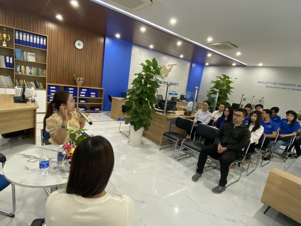 The gathering focused on introducing the banking sector and exploring the career opportunities it offers. Ms. Nguyen Thi Thuy shared personal stories about her professional journey and the successes brought about by the banking industry. She also emphasized the importance of specialized knowledge, soft skills, and commitment in career development within this field.