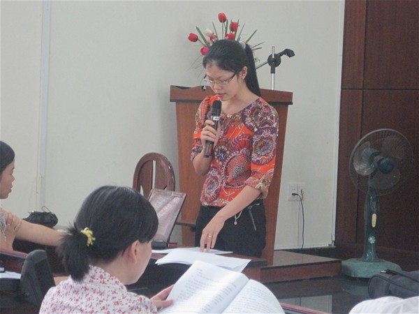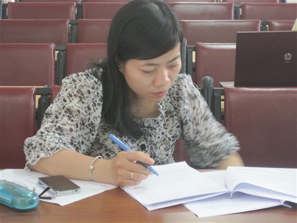 Cô Lê Thu Thủy- nhóm chuyên trách 7, đang góp ý tiêu chuẩn 1 và tiêu chuẩn 5...