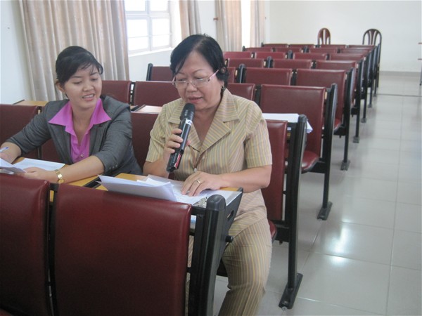 Cô Trần Thị Mỹ Hương- Trưởng nhóm chuyên trách 10, đang góp ý tiêu chuẩn 1 và tiêu chuẩn 5...
