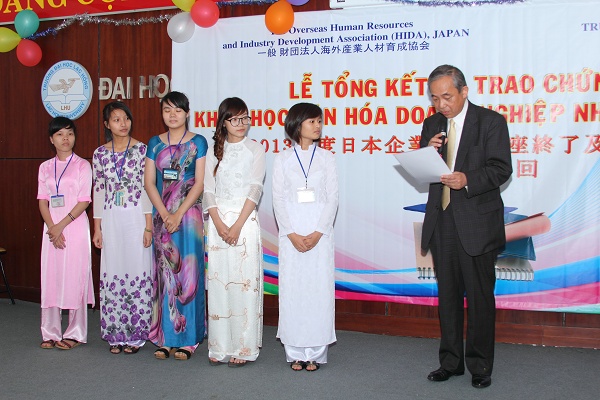 Recently, Lac Hong University in cooperation with HIDA (The Overseas Human Resources and Industry Development Association, Japan) held a ceremony to close Japanese Business Culture Course and grant certificates of completion to 65 senior students of Japanese Studies. The program took place at room B 203 with the participation of Management consultant Mr. Takeda Sadao;  Management consultant and lecturer of Japanese Corporate culture Mr. Masayuki Matsumura; LHU's Vice Rector and Head of Academic Affairs Department Lam Thanh Hien, MSc.; Vice Dean of Oriental Studies Nguyen Huu Nghi; Head of Japanese Studies branch Nguyen Thi Nhu Thuong, M.A.