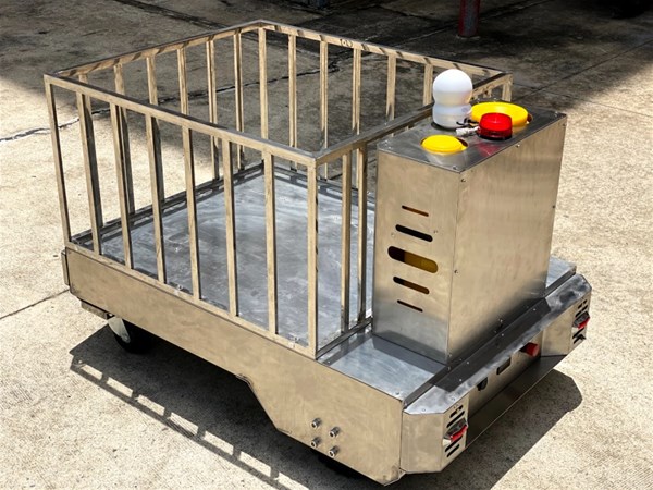 The transport robot was researched and created in seven days. It has a mass of 48 kg, a length of 1.3 m, a width of 0.9 m and a height of 0.8 m. It uses 2 motors installed on the rear wheel which is remotely controlled with the ability to transport 100kg of goods and necessities on flat terrain. There is a tray above to carry essentials, medicine,... The robot travels within a 200-meter range with a speed of 30m/min, operates continuously for 4 hours and takes 4 hours to fully charge the battery.