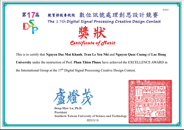 Three students including Nguyen Dac Mai Khanh, Tran Le Yen Nhi and Nguyen Quoc Cuong from Faculty of Information Technology, Faculty of English Language and Faculty of Mechatronics - Electronics, LHU on March 18 won the Excellence Award at the 17th Digital Signal Processing Creative Design Contest held by Southern Taiwan University of Science and Technology in coordination with Taiwan Ministry of Education.