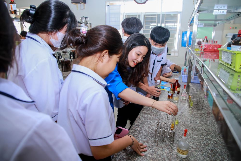 Opening the program, the delegation visited the LHU's Center of Scientific Research and Applications, gathering more than 30 practical laboratories and workshops serving disciplines such as Electrical - Electronics, Automation and Control, Automotive Technology, Food Engineering, Construction Engineering, Pharmacy; E-commerce,… The pupils had opportunities to experience the actual facilities, classrooms, laboratories, self-study areas,... and do experiments under the guidance of lecturers. In addition, they participated in a career orientation program at the Hall B201, chaired by Vice Rector Assoc. Prof. Dr. Nguyen Vu Quynh. Here, the participants listened to his sharing and consulting in choosing future careers. Introduction of admission regulations and training programs in 2023 were also provided to the pupils. They were answered questions related to training programs, learning conditions, costs, as well as job opportunities after graduation,...