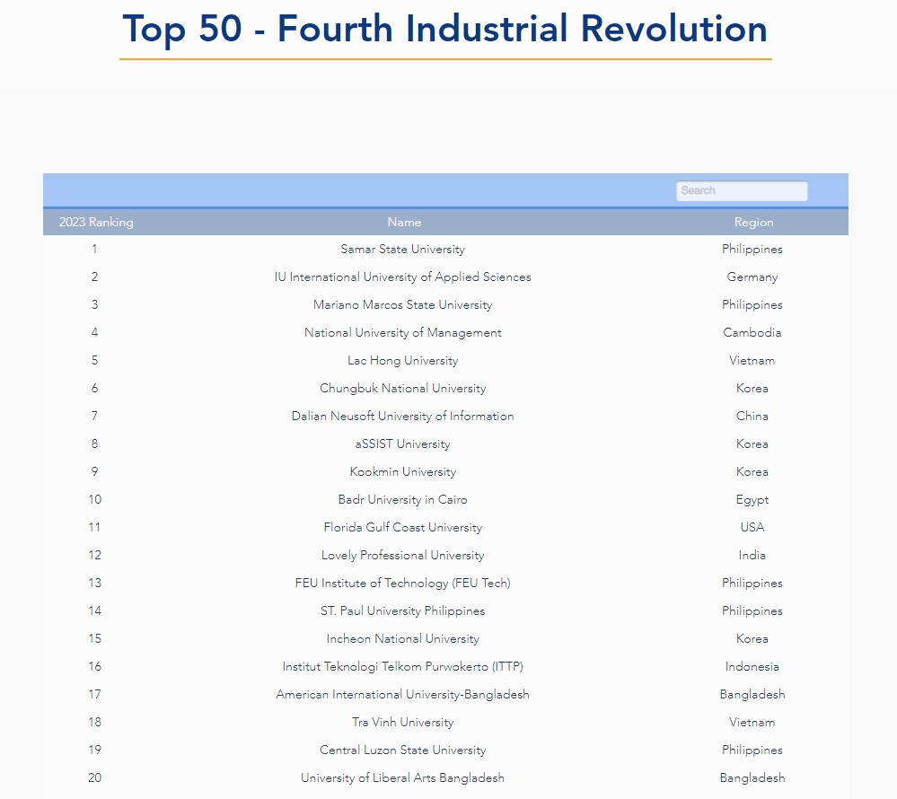 According to the WURI 2023, LHU ranks 5th in top 50 universities supporting Fourth Industrial Revolution