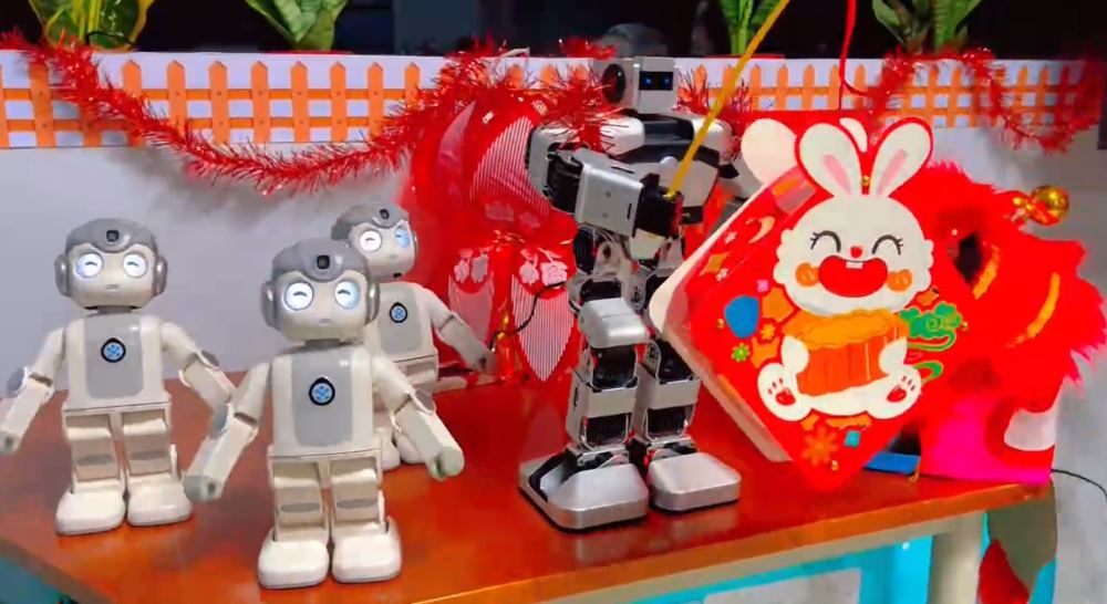 The art troupe to celebrate the Moon Festival consists of 9 robot artists including a yanshee robot, two Ruzf robots, and six Alpha Mini robots. This special robot squad can perform waving and turning movements with smooth and rhythmical moves. They are equipped with LED lights and decorative accessories, creating a lively and colorful scene. The combination of technology and traditional culture has brought a featured Mid-Autumn Festival space.