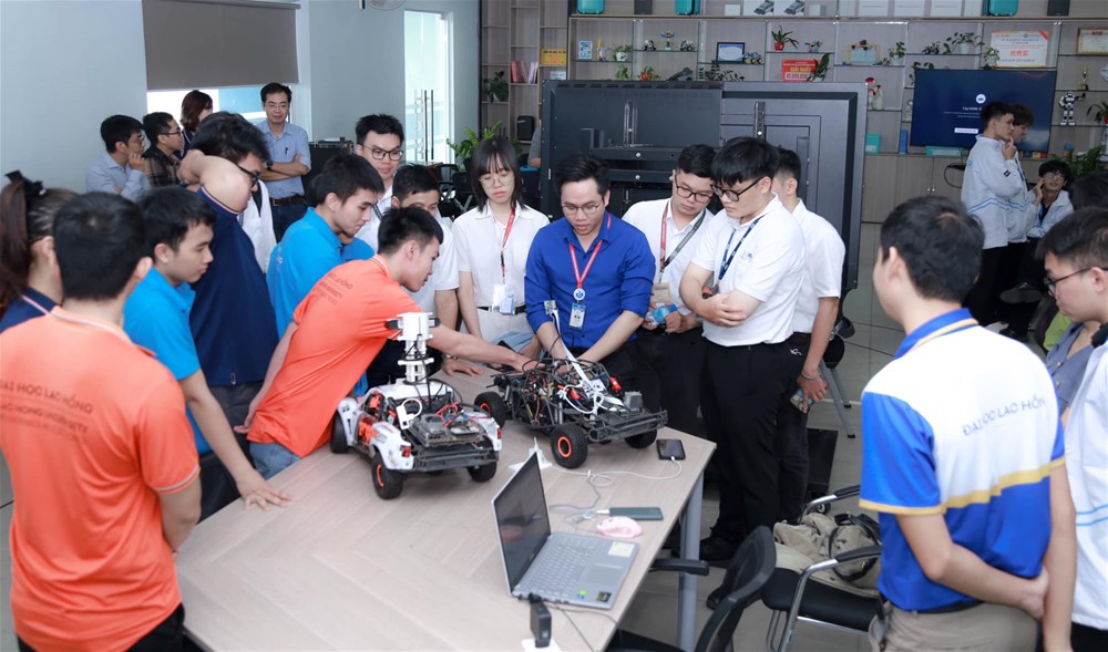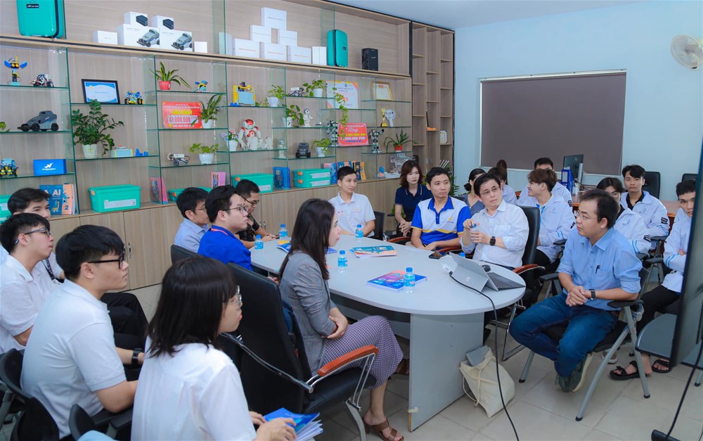 Welcoming the delegation were DSc. Lam Thanh Hien - Rector; MSc. Nguyen Minh Son - Vice Dean of the Faculty of Information Technology; DSc. Hoang Ngoc Tan - Head of the Automotive Engineering Department, some English Language majors; lecturers and students majoring in AI.