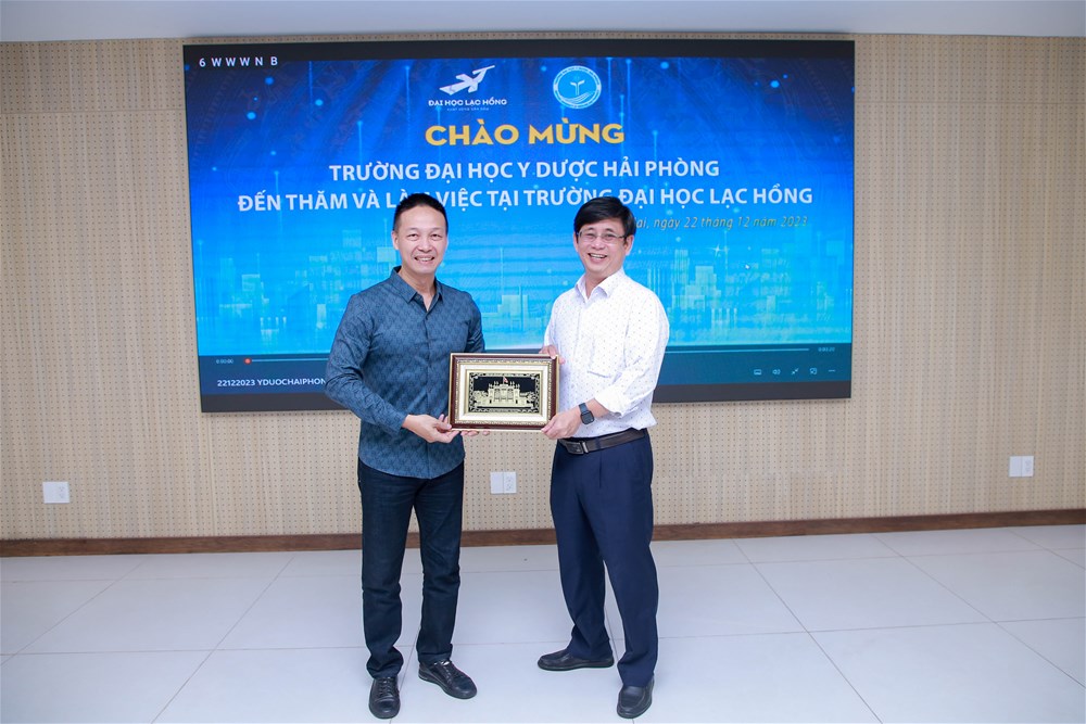 Dr. Lam Thanh Hien giving souvenirs to the representative of Hai Phong University of Medicine and Pharmacy