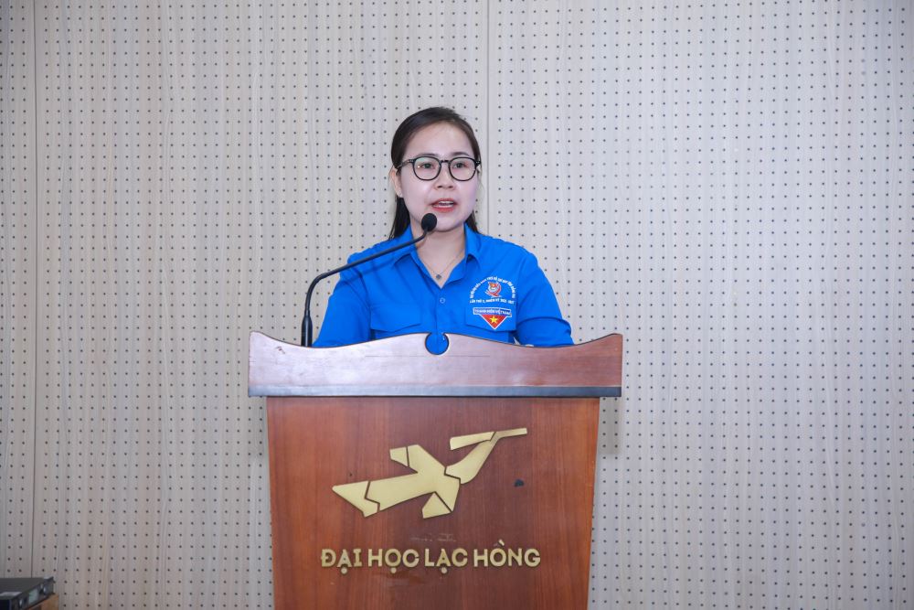 Secretary of the University Youth Union Truong Le Bao Trinh presenting a report summarizing the Youth Union work and youth movements of LHU