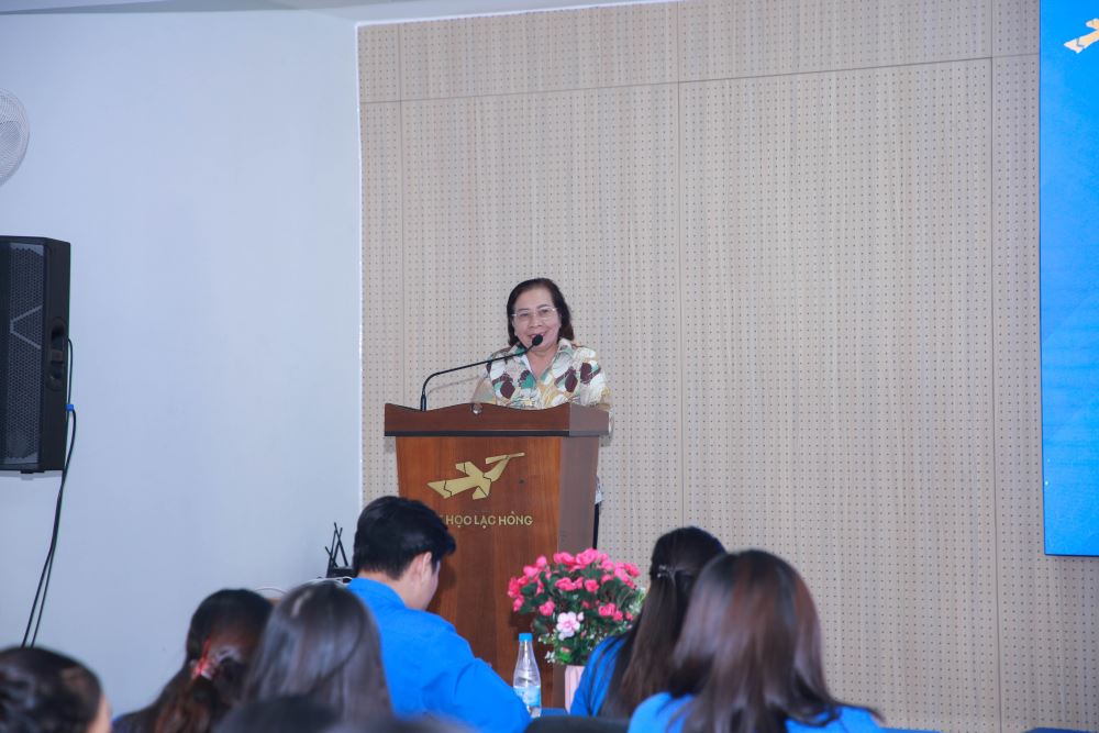 Deputy Secretary of the University Party Committee, Vice Rector Nguyen Thi Thu Lan giving a speech