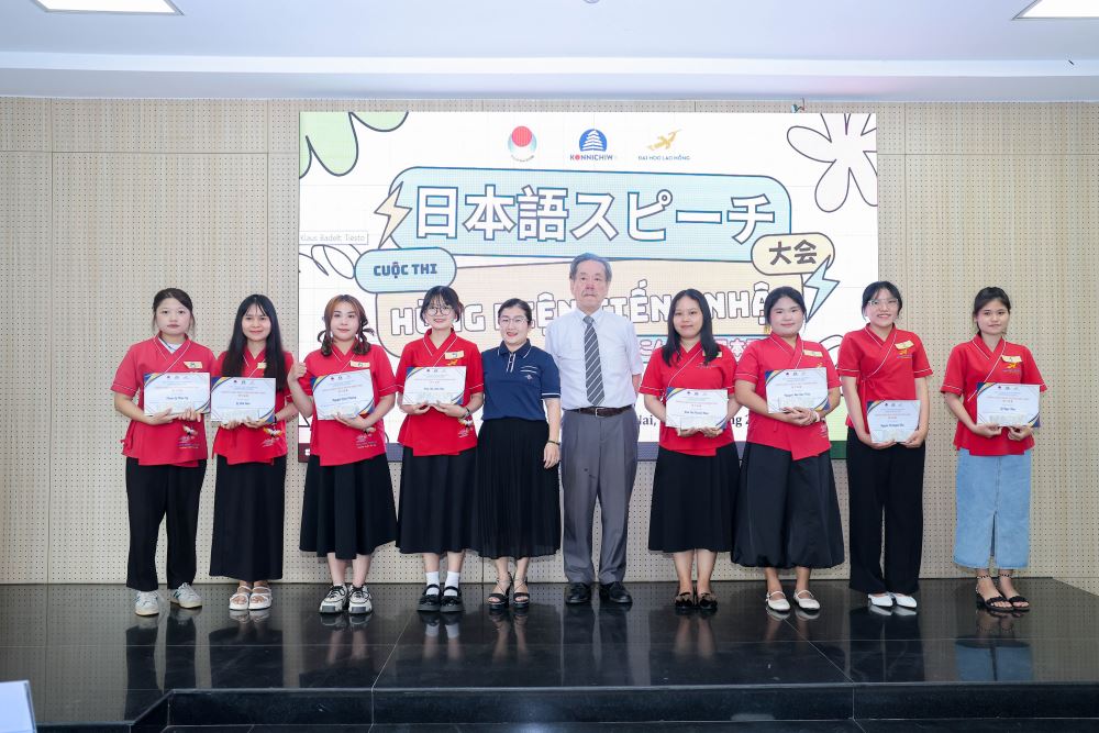 The event saw the presence of Mr. Tachiyashiki Sunao – Director of the Konnichiwa Japanese Language Joint Stock Company; Mr. Watanabe Mikio – Deputy Director of the Konnichiwa International Education Company Limited. From LHU, attendees included M.A Tran Minh Thuy Duong – Head of the Department of Japanese Studies; M.A Tran Thi Gai – Head of the Japanese Studies Division; along with lecturers and students of the Department.