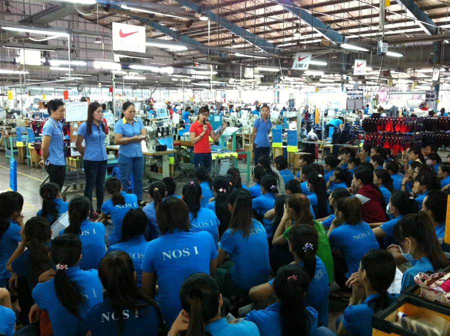 Cựu sinh viên Hồng Hoa (áo đỏ) đang trao đổi công việc với nhân viên của mình