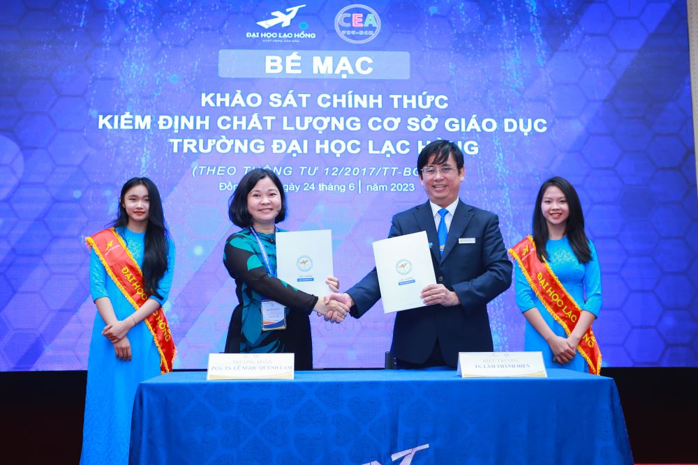 Assoc. Prof. Dr. Le Ngoc Quynh Lam - Director of the CEA - VNUHCM and Dr. Lam Thanh Hien - Rector of LHU jointly signing the minutes of completing the official assessment on June 24