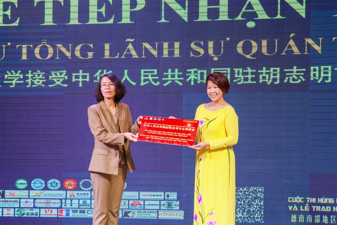 Representing the University’s leadership, Dr. Do Thi Lan Dai (in ao dai) receiving contributions from Ms. Tan LingYan, Consul of the Consulate General of China in Ho Chi Minh City