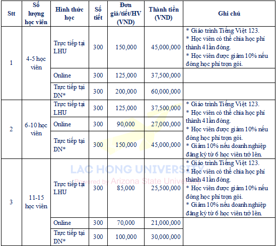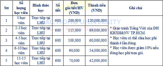 Có thể đăng ký chương trình đào tạo tiếng Việt 1 năm hoặc lớp ngắn hạn (2 tháng/khoá tổng 5 khoá, lớp 1 học kỳ) và lấy chứng chỉ từ “Chương trình đào tạo tiếng Việt” của Đại học Lạc Hồng.