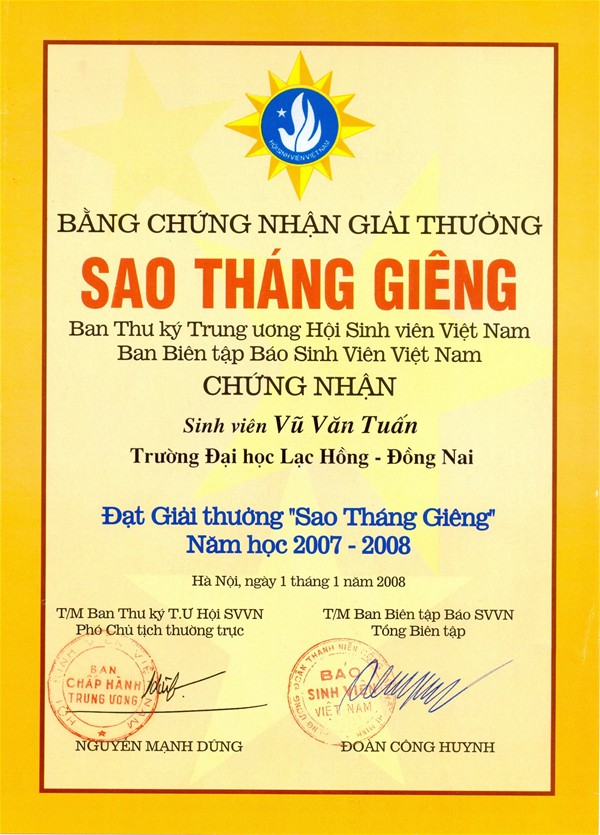 đã vinh dự được nhận Giải thưởng cao quý Sao Tháng giêng năm học 2007 - 2008 do Trung ương Hội Sinh viên Việt Nam trao tặng