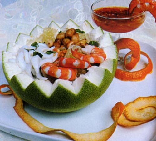 Bien Hoa’s people also create many special dishes from pomelos like goi buoi, pomelo juice, and pomelo wine, pomelo sweet soup, pomelo roll… In particular, goi buoi is famously delicious because all ingredients are home-grown, simple and easy to find. People use Thanh pomelos (little water, crisp, sour and slightly sweet) to make goi buoi (pomelos mixed with shrimp caught from Dong Nai river, rau thom (kinds of vegetables that have smell), ground peanuts, pork meat, carrot, pepper, sugar, fish sauce, garlic, chili,…). People can enjoy goi buoi with young pomelo leaves, baked girdle cakes, bringing their appetite due to light sour, sweet, spicy, and buttery tastes of all ingredients.