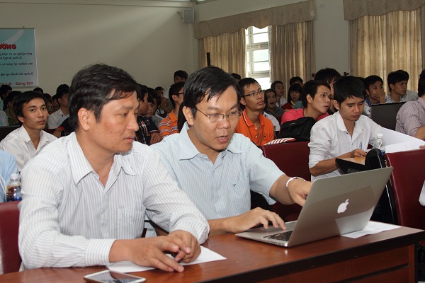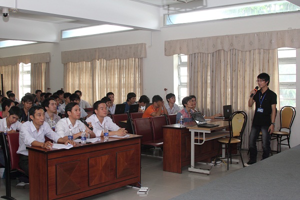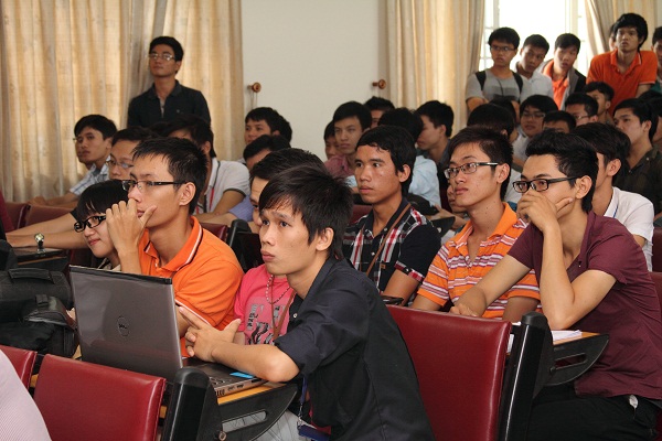 Các tân sinh viên chăm chú lắng nghe các "tiền bối" trình bày ý tưởng
