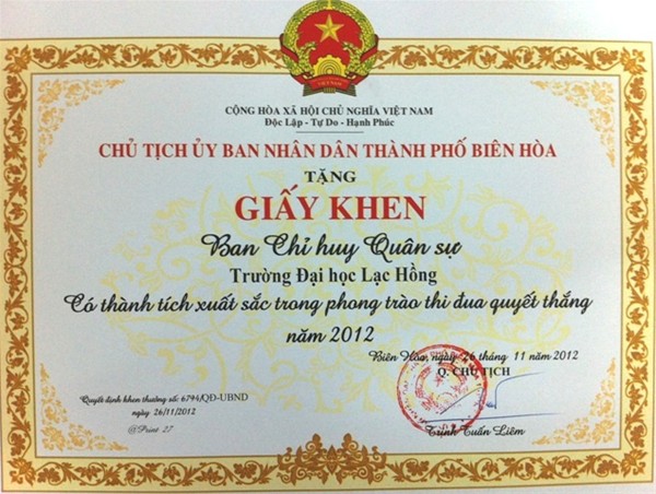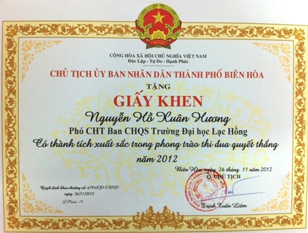 Ghi nhận những thành tích của Ban chỉ huy quân sự Trường Đại học Lạc Hồng trong phong trào thi đua quyết thắng năm 2012, ngày 26/11/2012 Chủ tịch Ủy ban nhân dân thành phố Biên Hòa đã ký quyết định trao tặng giấy khen cho tập thề Ban chỉ huy quân sự Trường Đại học Lạc Hồng – cụm trưởng cụm thi đua 17 và cá nhân Cô Nguyễn Hồ Xuân Hương – Chỉ huy phó Ban chỉ huy quân sự nhà trường vì đã có thành tích xuất sắc trong phong trào thi đua quyết thắng năm 2012.
