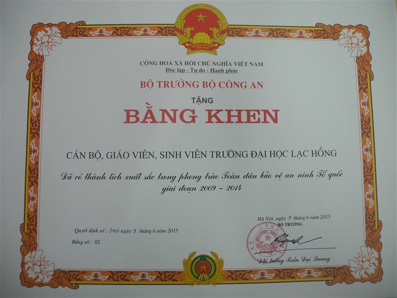 Tại hội nghị, Trường Đại học Lạc Hồng vinh dự là một trong ba đơn vị trong toàn tỉnh được nhận Bằng khen của Bộ trưởng Bộ Công an và tham gia giao lưu vinh danh các đơn vị điển hình tiên tiến trong phong trào toàn dân bảo vệ ANTQ. Ngoài ra, cá nhân NGND. TS Đỗ Hữu Tài cũng được Bộ Công an trao tặng Kỷ niệm chương bảo vệ an ninh tổ quốc.