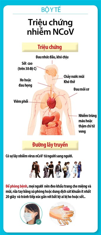 Các triệu chứng của bệnh nhân mắc nCoV từ nhẹ đến nặng bao gồm: sốt, ho và khó thở. Các triệu chứng này có thể xuất hiện từ 02 đến 14 ngày sau khi tiếp xúc nguồn bệnh. Tới khi khởi phát, nCOV gây sốt và có thể tổn thương đường hô hấp. Trường hợp nặng, gây viêm phổi và có thể nhiều cơ quan khác trong cơ thể khiến bệnh nhân tử vong, nhất là các trường hợp có bệnh nền.