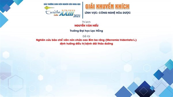🌟Chúc mừng em NGUYỄN VĂN HIẾU, sinh viên khóa K16 Khoa Dược Đại học Lạc Hồng đã nhận giải thưởng Eureka trong lĩnh vực Công nghệ Hóa Dược.