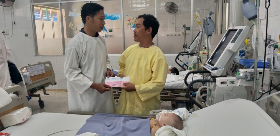 Thầy Vũ Văn Tuấn trao quà cho các bé tại Khoa tim mạch thận niệu