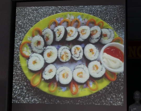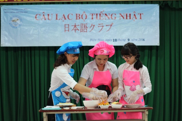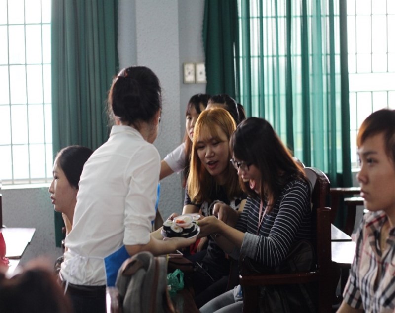 - Thi làm Sushi dưới sự hướng dẫn của ban tổ chức. Có 4 bạn sinh viên gồm 3 nữ 1 nam xung phong lên thi đấu. Bạn nam duy nhất là người làm Sushi đẹp nhất và được nhận quà tặng.
