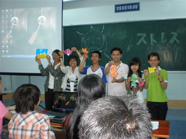 昨日日本クラブはE408教室で2010年10月14日の16時半に行って。Hôm qua ngày 14 tháng 10 năm 2010, vào lúc 16h30, câu lạc bộ tiếng Nhật được tổ chức tại phòng E408. 今回日本クラブは楽しく行っている。Câu lạc bộ tiếng Nhật lần này diễn ra rất sôi nổi. 一年生も参加した。Sinh viên năm nhất cũng tham dự. 日本語が話せないけどう、一年生は一生懸命参加した。Mặc dù chưa nói được tiếng Nhật nhưng các sinh viên năm nhất hưởng ứng rất nhiệt tình. 相談した後、皆さんは面白い映画を見たり、ゲムをしたり、日本語の歌を歌ったりする。Sau khi thảo luận các bạn sinh viên cùng nhau xem đoạn phim hoạt hình vui, cùng nhau chơi trò chơi và hát bài hát tiếng Nhật. Sau đây là một số hình ảnh câu lạc bộ lần này.