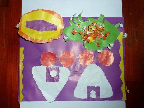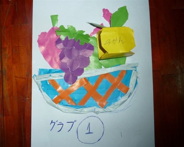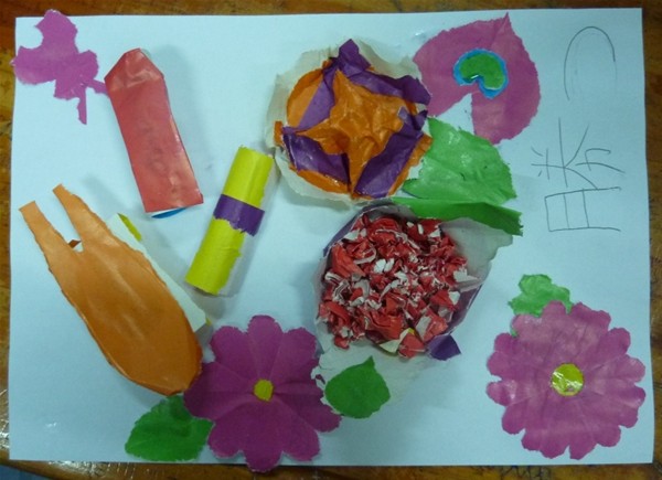 皆は一緒に食品の形のように色紙で破って、白い紙に貼った