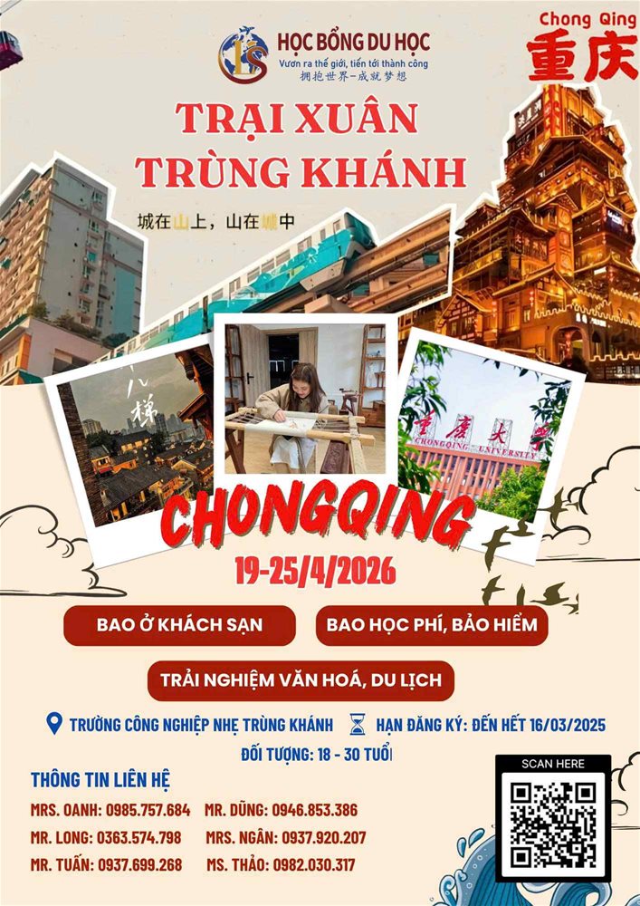 Nhằm tạo điều kiện cho sinh viên được trải nghiệm môi trường học tập quốc tế, nâng cao năng lực ngoại ngữ, hiểu biết văn hóa – xã hội Trung Quốc và phát triển kỹ năng hội nhập, Trường thông báo tuyển sinh Chương trình Trại Xuân Trùng Khánh 2026 với nội dung phong phú, kết hợp giữa học tập, -giao lưu và du lịch trải nghiệm.