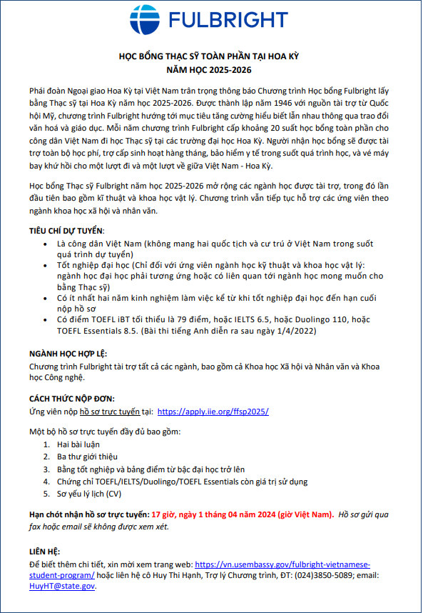 Đại sứ quán Hoa Kỳ tại Việt Nam xin gửi tới Quý Trường lời chào trân trọng và xin thông báo về Chương trình học bổng Thạc sỹ Fulbright, năm học 2025-2026.
