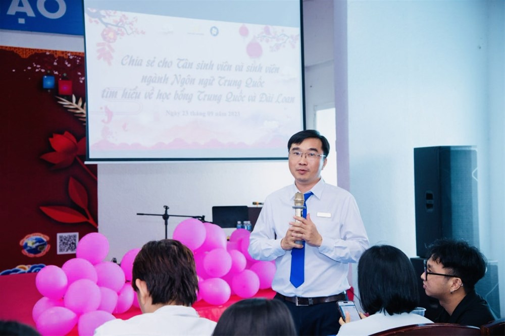 Teacher Phan The Anh, Head of Chinese Language Department, delivering speech and advising freshmen on career orientation