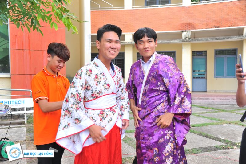 Cũng tại những gian trưng bày sản phẩm, không chỉ các bạn nữ mà các bạn nam cũng rất thích thú hóa trang mình trong những bộ trang phục truyền thống của các ngành ngôn ngữ như: Ngôn ngữ Nhật bản, ngôn ngữ Trung Quốc, ngôn ngữ Hàn Quốc và ngôn ngữ Anh đang được đào tạo tại Khoa Ngôn ngữ Anh và Khoa Đông Phương.