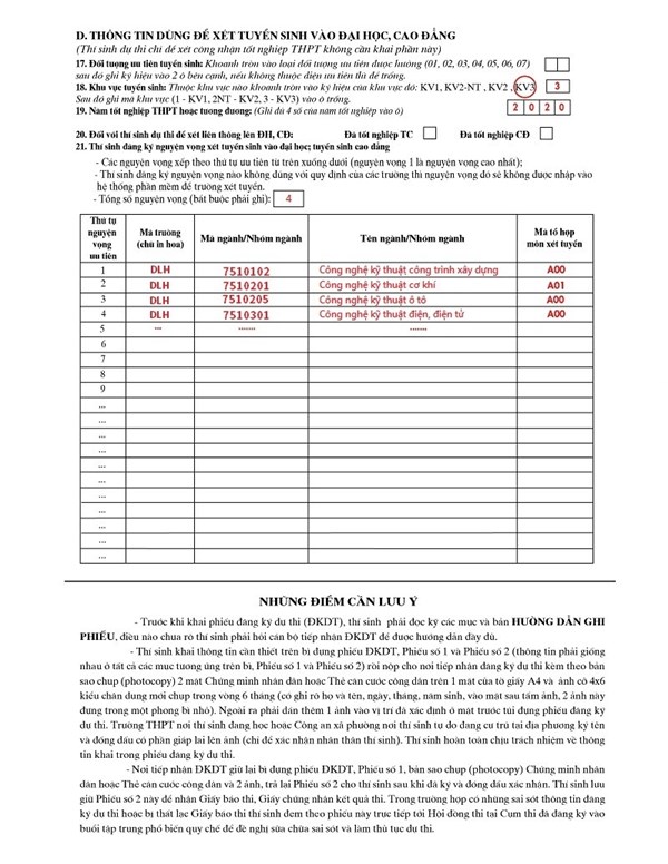 Mục 17, 18: Khoanh tròn và ghi đúng ký hiệu theo quy định. Riêng với khu vực tuyển sinh, trong 3 năm THPT, bạn học ở đâu lâu hơn thì được hưởng ưu tiên khu vực đó.
