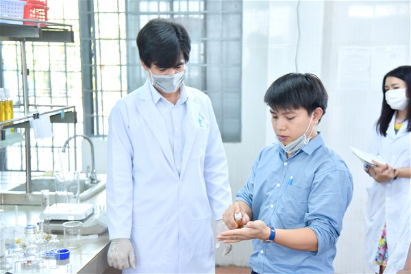 Hình ảnh đội ngũ giảng viên LHU điều chế nước rửa tay Nano bạc