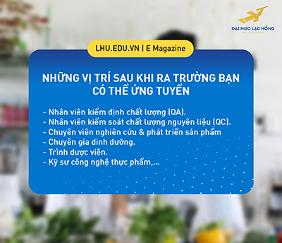 Bạn cũng có thể trở thành chuyên gia tư vấn dinh dưỡng hoặc các bộ phận liên quan đến đảm bảo chất lượng, kiểm nghiệm tại các trung tâm dinh dưỡng, trung tâm y tế & y tế dự phòng. Những vị trí sau khi ra trường bạn có thể ứng tuyển: