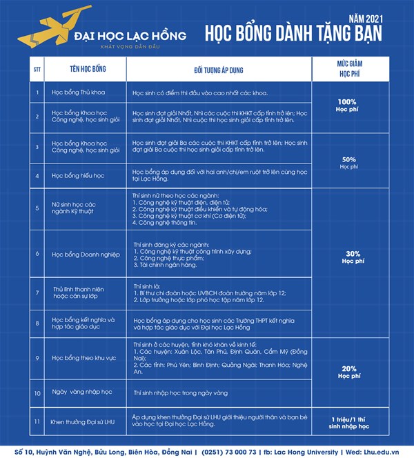 Các bạn thí sinh còn chần chừ gì không nhanh tay đăng ký xét tuyển ngay TI ĐÂY để nhận ngay học bổng cực kỳ hấp dẫn tại Trường Đại học Lạc Hồng đang chờ đón bạn!