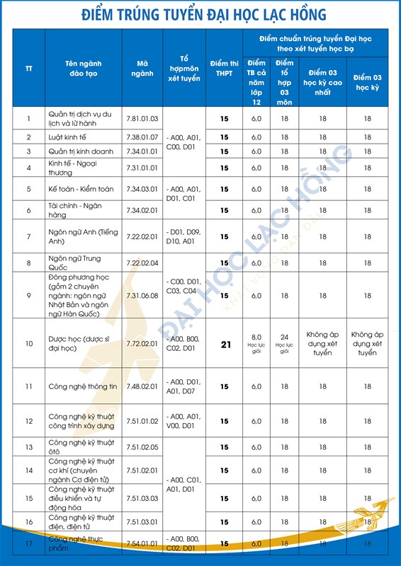 Trường Đại học Lạc Hồng chính thức công bố điểm trúng tuyển Đại học năm học 2021 - 2022 theo các phương thức như sau: