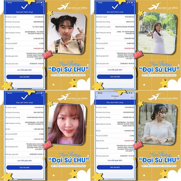 Đầu tháng 9 năm 2021, Trường Đại học Lạc Hồng đã trao khen thưởng đợt 1 đến với 54 sinh viên trường đã tích cực tham gia chương trình Đại sứ LHU với số tiền 67 triệu đồng.