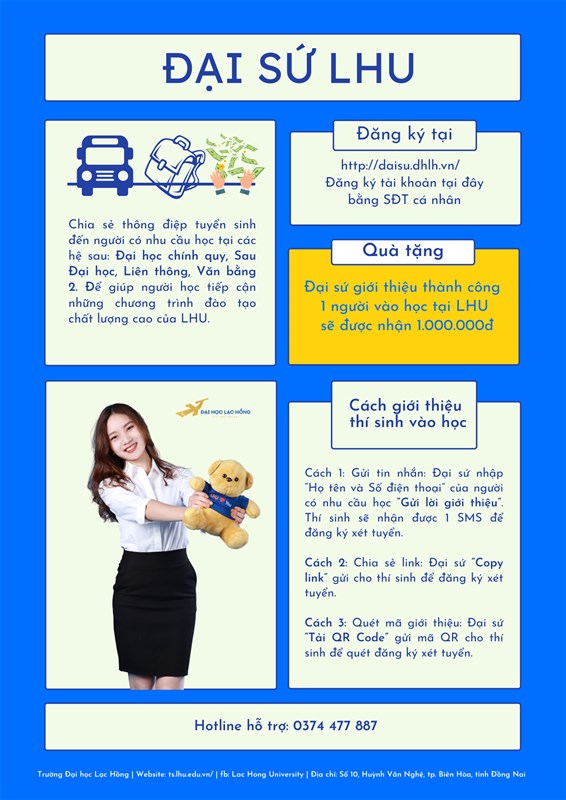 Trường Đại học Lạc Hồng phát động Chương trình Đại sứ LHU đến toàn thể cán bộ, giảng viên, nhân viên và sinh viên trong trường hãy gánh vác sứ mệnh lan toả tri thức đến cho bạn bè và người thân. Giúp bạn bè và người thân định hướng cho mình hướng đi đúng đắn và có một tương lai tươi sáng hơn khi tham gia học tập tại Đại học Lạc Hồng.