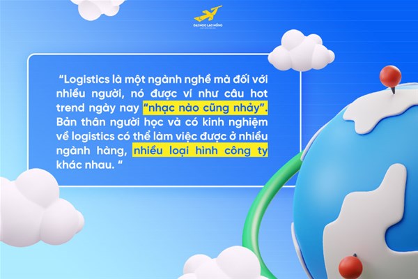 Logistics bước vào thị trường bằng một sự tự tin với câu châm ngôn “nhạc nào cũng nhảy”. Điệu nhảy được bắt đầu bởi sự năng động của ngành hàng, với các nốt nhạc trầm bổng của thị trường và sự vận động không ngừng của cách nhà máy và nhà tiêu thụ. Khi làm logistics, các bạn có thể trải nghiệm và đặt mình vào nhiều vị trí khác nhau. Đó là một người nhân viên tại công ty xuất nhập khẩu, làm việc tại các cảng hàng hóa, tại các công ty giao hàng, công ty vận chuyển hay các sàn thương mại điện tử - nơi đòi hỏi việc luân chuyển hàng hóa cực kỳ cấp thiết và kịp thời.