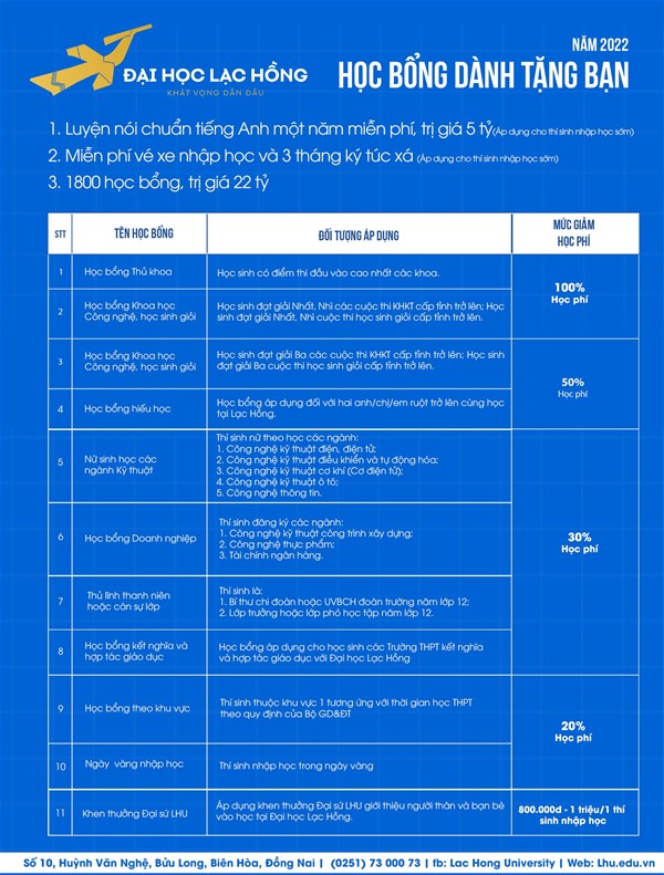 Các bạn thí sinh còn chần chừ gì không nhanh tay đăng ký xét tuyển ngay TẠI ĐÂY để nhận ngay học bổng và các chế độ chính sách, ưu đãi cực kỳ hấp dẫn tại Trường Đại học Lạc Hồng đang chờ đón bạn.
