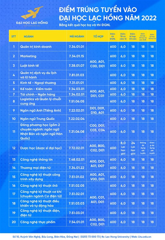Trường Đại học Lạc Hồng thông báo xét tuyển bổ sung cho 20 ngành đào tạo hệ đại học chính quy, năm 2022 cho phương thức xét tuyển dựa vào Kết quả thi THPT và phương thức xét tuyển học bạ, phương thức xét tuyển bằng kỳ thi đánh giá năng lực.