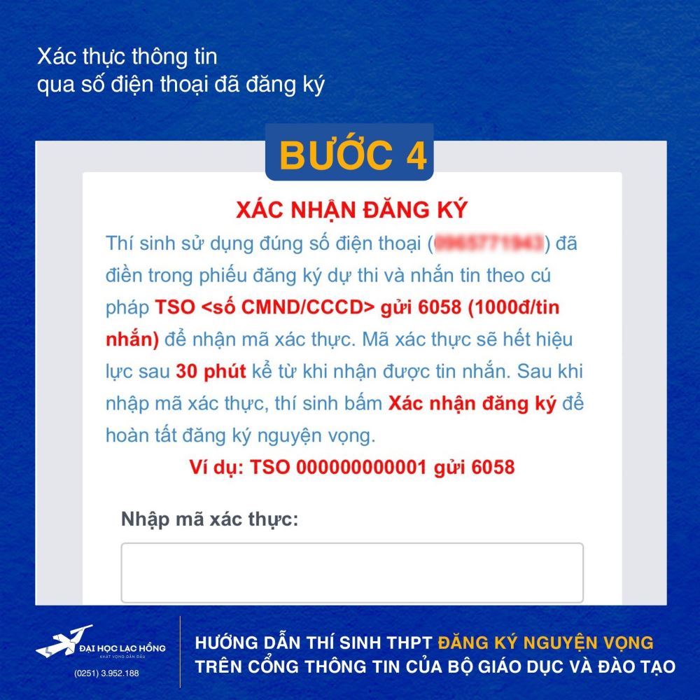 - Xác thực thông tin qua số điện thoại đã đăng ký. Thí sinh sử dụng đúng số điện thoại đã điền trong phiếu đăng ký dự thi và nhắn tin theo cú pháp TSO<số CMND/CCCD> gửi 6058 để nhận mã xác thực.